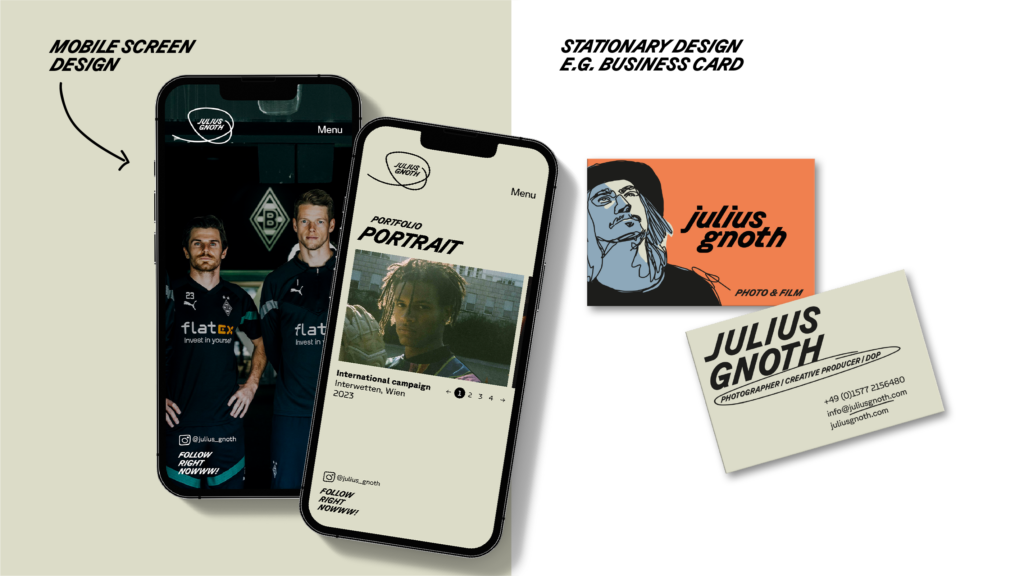 Julius Gnoth ist ein Ausnahmefotograf aus dem Ruhrgebiet. Mit dem Schwerpunkt People/Portrait und einem lichtdurchfluteten Studio in Essen-Rüttenscheid hat er bereits weltbekannte Gesichter fotografiert. Wir durften für ihn ein bildgewaltiges, illustratives Corporate Design entwickeln, das seiner eigenen Bildsprache nicht im Weg steht, sondern sie harmonisch ergänzt.