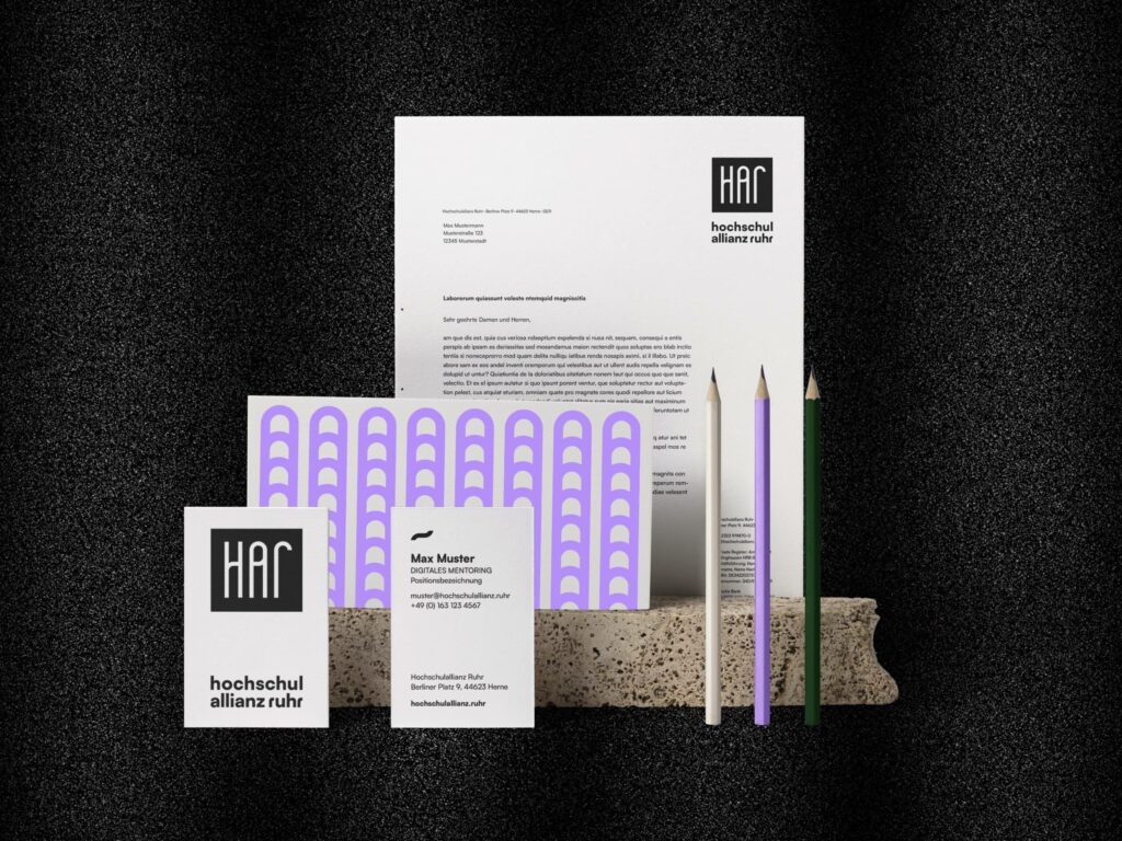 Neues Corporate Design für die Dachmarke Hochschulallianz Ruhr (HAR). Die HAR ist ein Verbundprojekt der Hochschule Bochum, Fachhochschule Dortmund und der Westfälischen Hochschule. Sie dient als Brücke zwischen den einzelnen Hochschulen sowie wird sie als “das Tor zur Wissenschaft” gesehen – Die Bildmarke bietet die grafische Übersetzung.